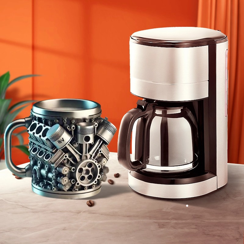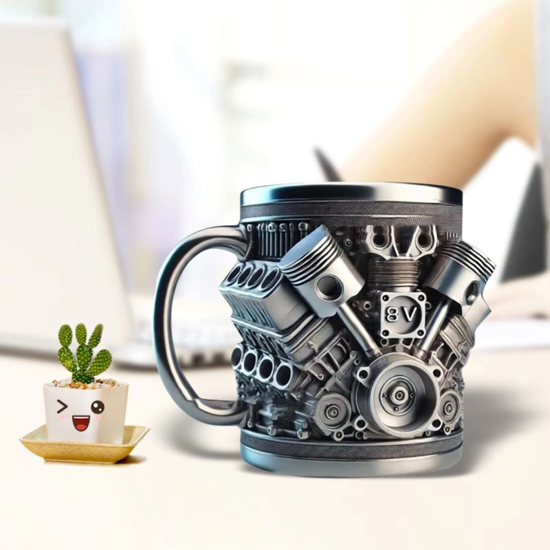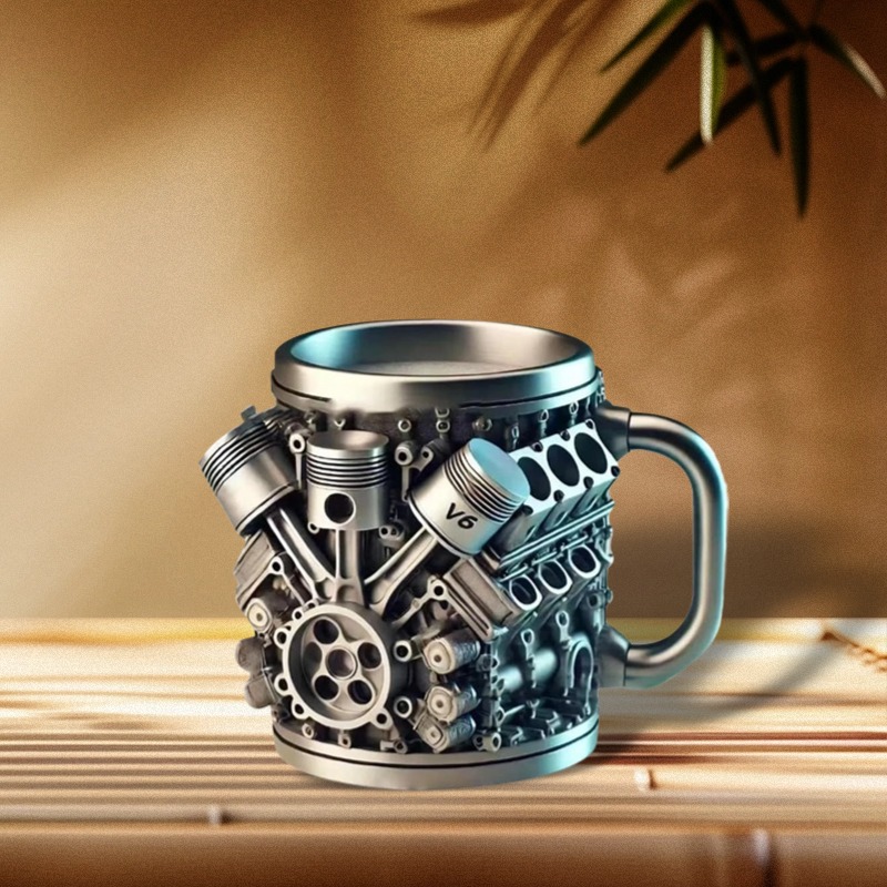 Unique Design: Engine-shaped V8 and V6 mugs with a creative mechanical aesthetic.
